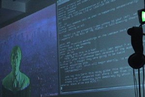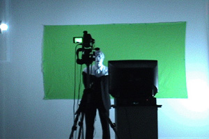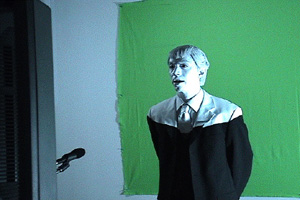 | Above: Cicero beginning the "Repubocracy" monologue at Location One in the greenscreen area of the gallery. Below: Cicero's monologue as it appeared projected to the audience at Location One, mixed with the video environment. (The online text performance space is visible to the right in the photo at lower left). | |