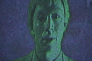 | Above: Cicero beginning the "Repubocracy" monologue at Location One in the greenscreen area of the gallery. Below: Cicero's monologue as it appeared projected to the audience at Location One, mixed with the video environment. (The online text performance space is visible to the right in the photo at lower left). | |